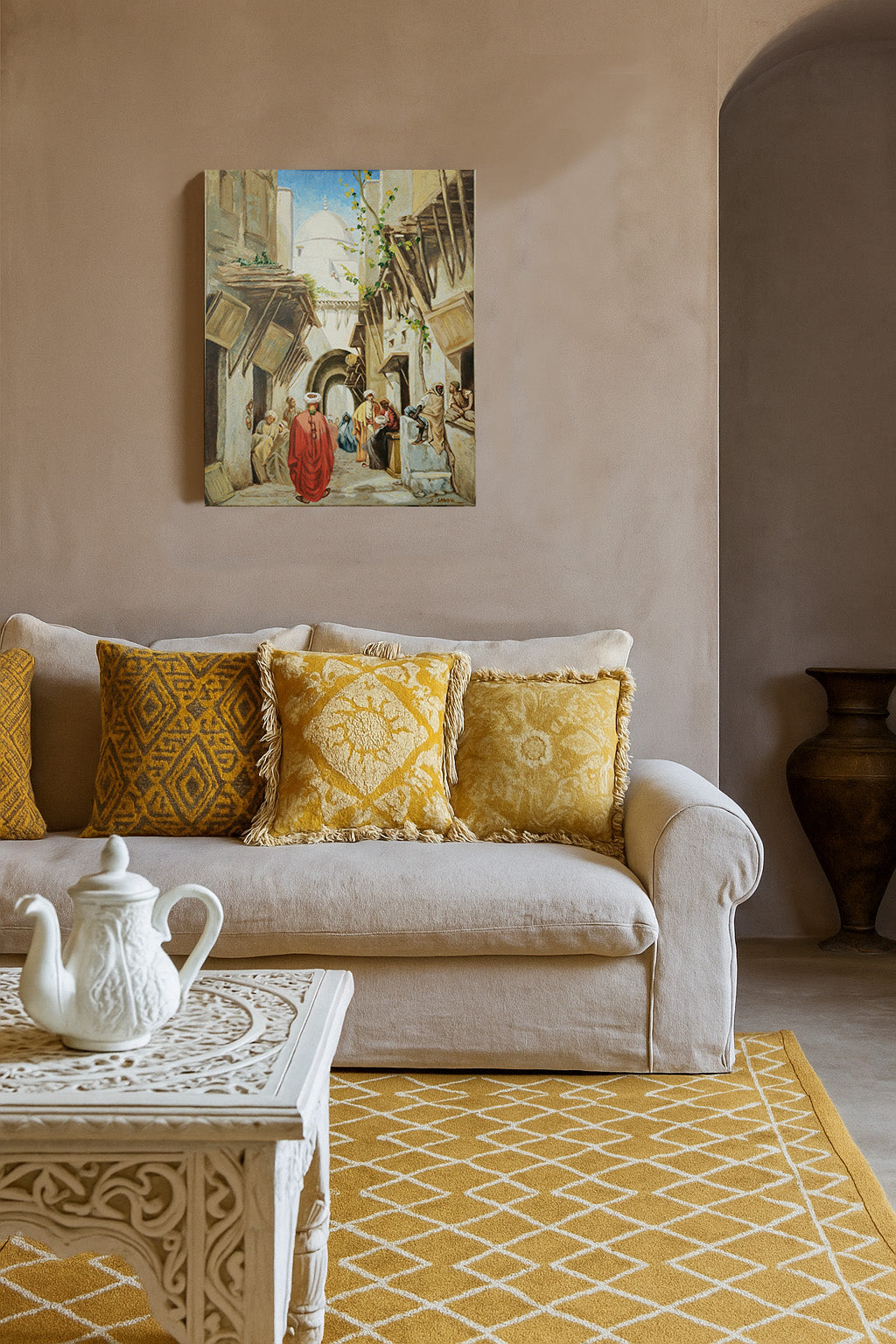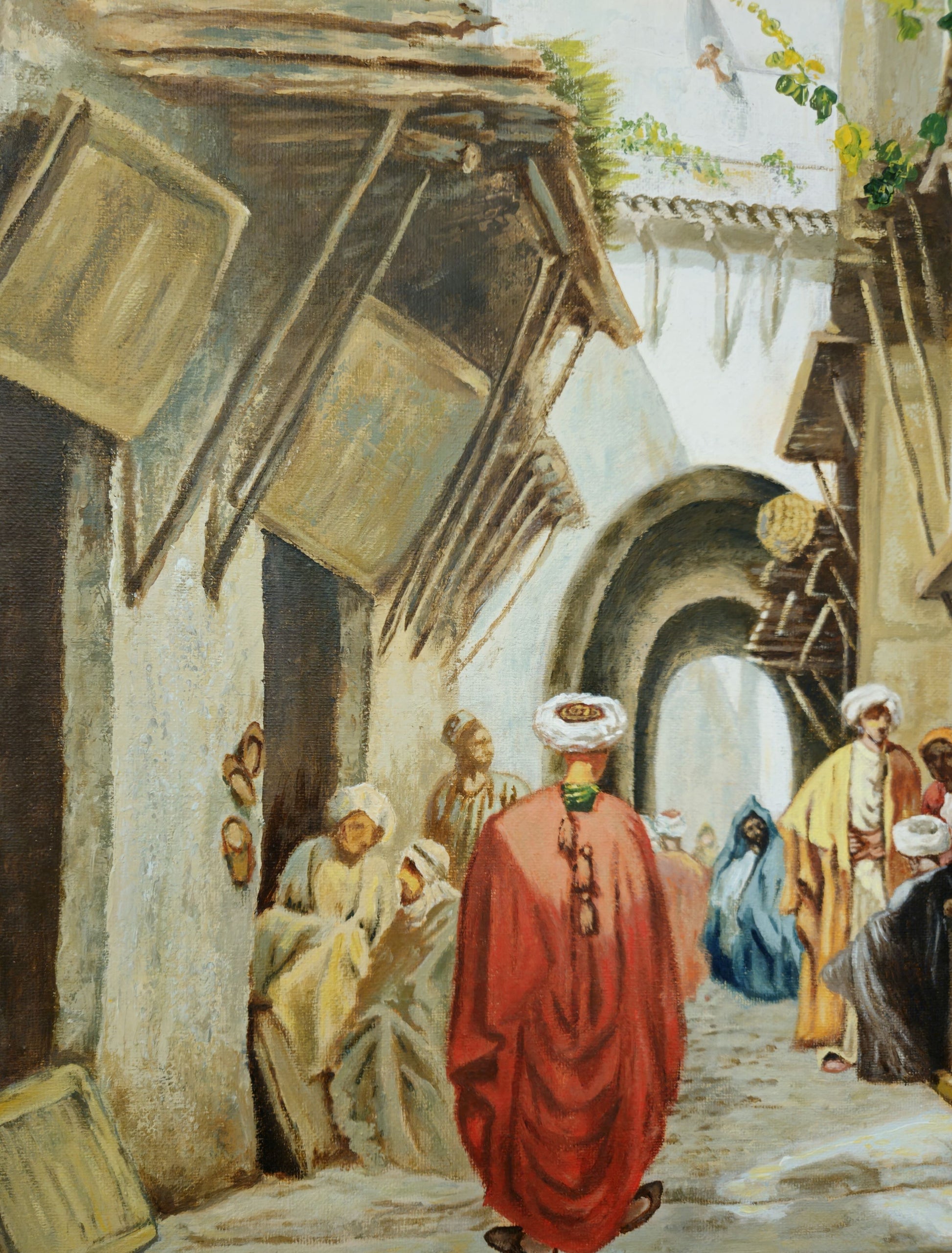 Immerse yourself in the authenticity of traditional alleyways through this magnificent, finely painted work. The scene depicts a bustling street in the Kasbah in 1875, where passersby dressed in traditional clothing cross paths under wooden awnings, with the white dome of a mosque in the background. The warm colors and meticulous details convey all the life and charm of an architectural and cultural heritage.