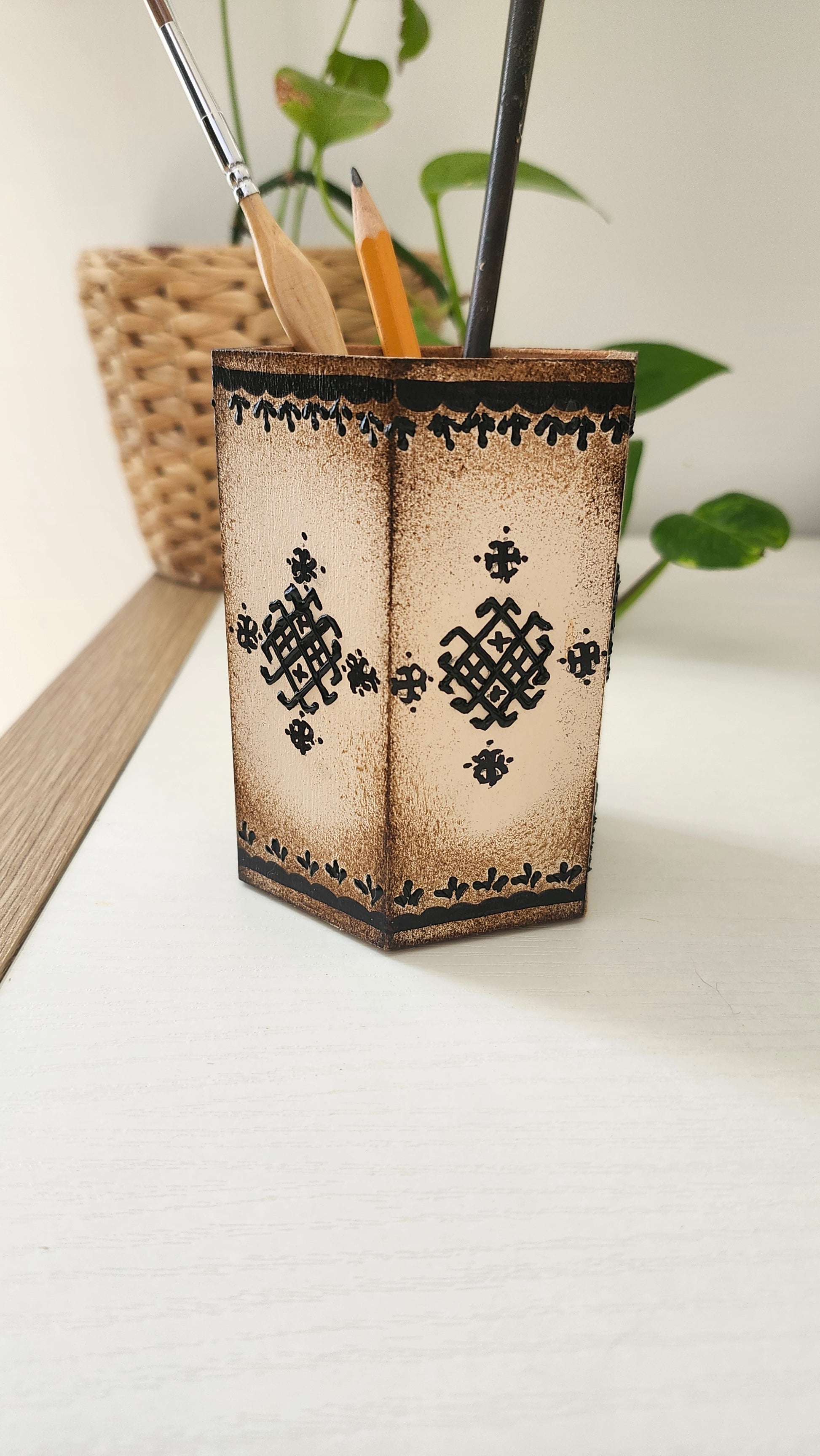 Porte-stylos artisanal en bois, de forme hexagonale, entièrement fait à la main. Chaque pièce est peinte à l’acrylique et décorée de signes et symboles berbères, réalisés en cerné en relief, offrant profondeur, texture et authenticité.