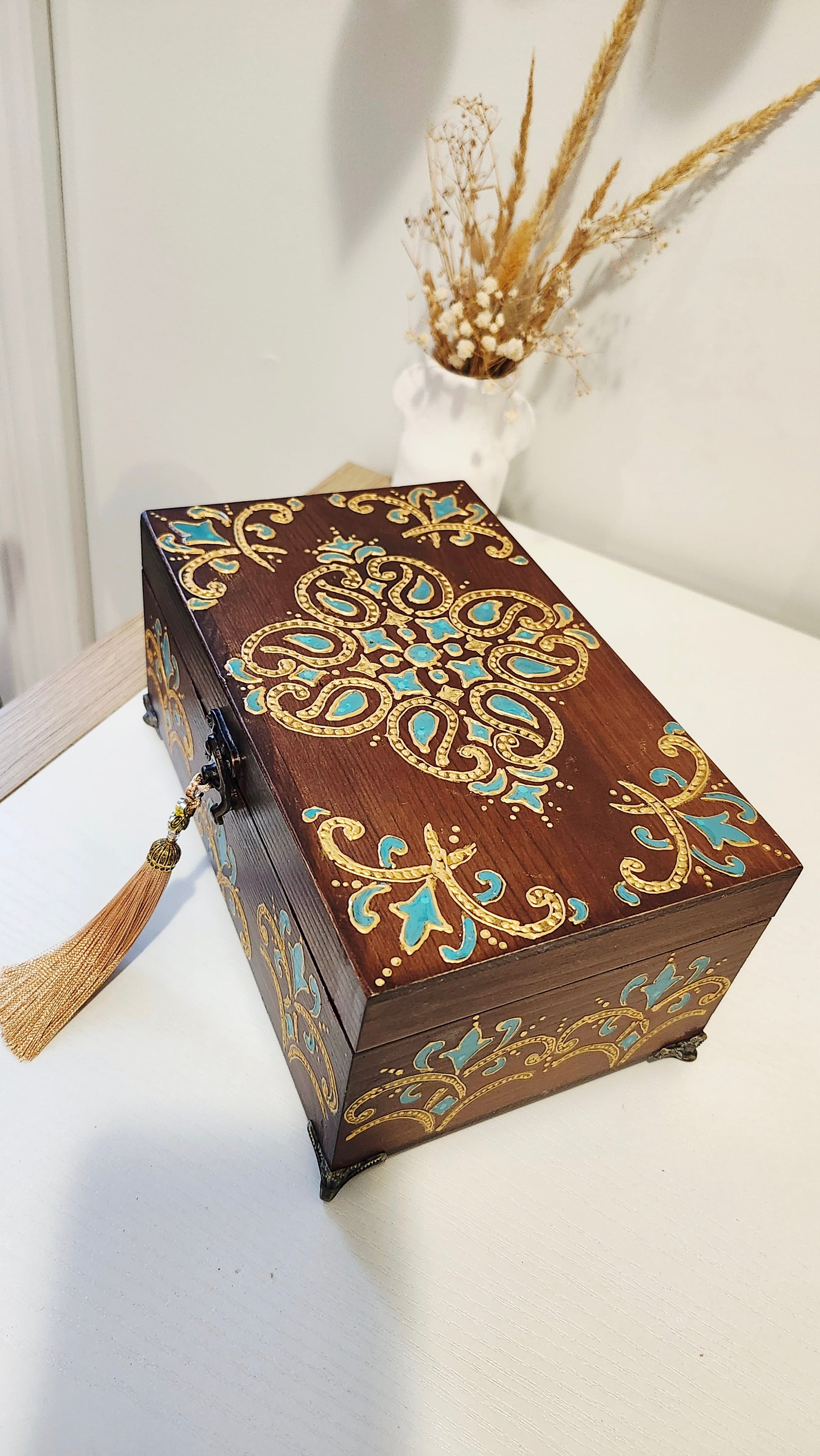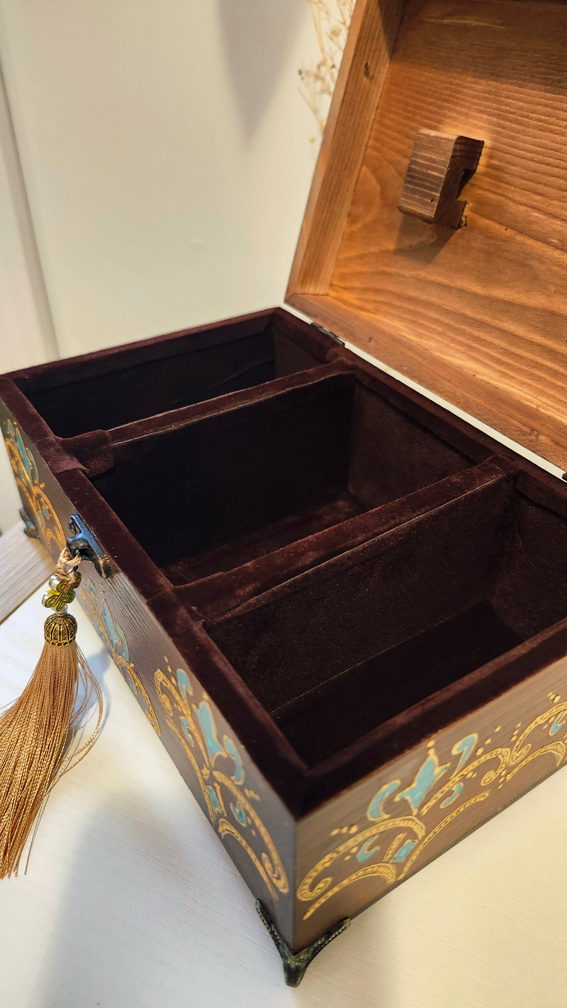 Ce magnifique coffre en bois est entièrement décoré à la main avec de la peinture acrylique, sublimée par des motifs floraux en relief délicatement cernés, offrant un rendu raffiné et authentique.